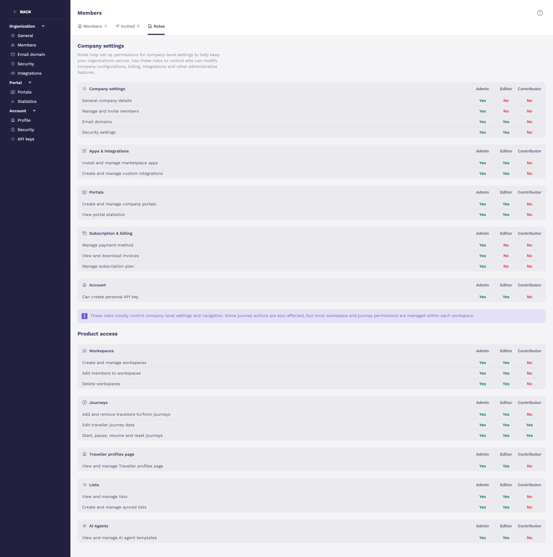 Important: Company roles do not change permissions inside individual workspaces or journeys except for that contributors cannot add or remove travellers from a journey.